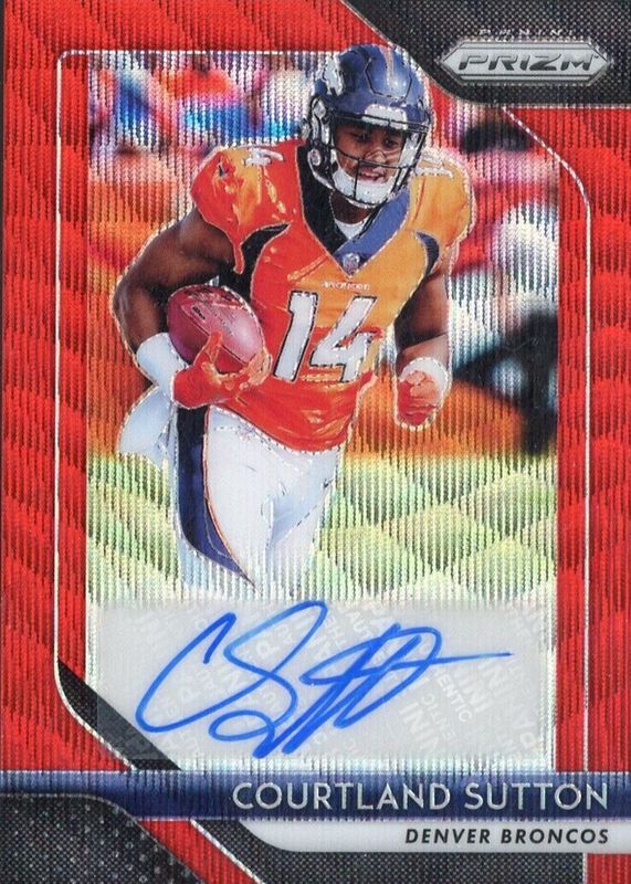 Courtland Sutton's Football cards are available in at least 40 sets. Courtland Sutton's biggest 7-day price movers are 2018 Prizm #215 Base, 2018 Prizm #RI-15 Rookie Introduction, and 2018 Phoenix #115 Base.