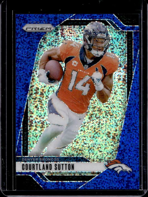 The Courtland Sutton 2024 Prizm #86 Blue Sparkle /96 card is 1 of 85 Courtland Sutton's card variations in the 2024 Prizm set being tracked by Sports Card Investor, including Base, Choice Blue Yellow Green, Choice Silver, Disco, and Green.