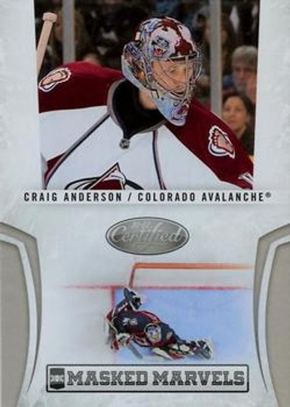 The Craig Anderson 2010 Certified #8 Masked Marvels /500 card is 1 of 43 Craig Anderson's card variations in the 2010 Certified set being tracked by Sports Card Investor, including Base /799, Platinum Red /999, Platinum Blue /250, Mirror Red Materials Dual /150, and Mirror Blue Materials /100.