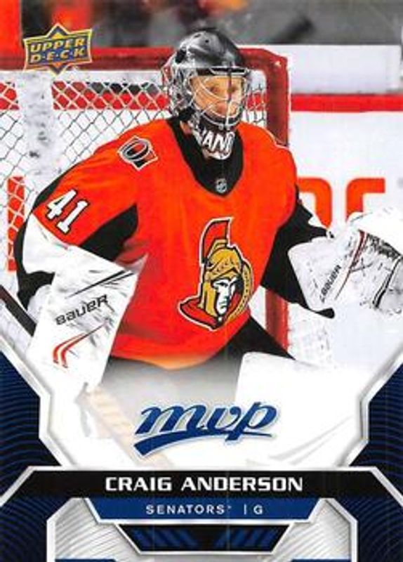 The Craig Anderson 2020 Upper Deck MVP #82 Blue card is 1 of 12 Craig Anderson's card variations in the 2020 Upper Deck MVP set being tracked by Sports Card Investor, including Base, Gold Script, Puzzle Backs, Silver Script, and Super Script /25.