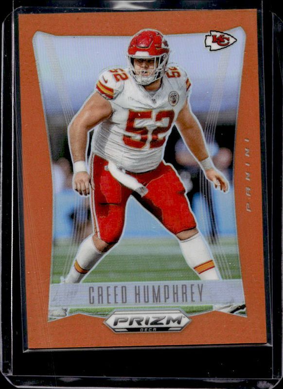 The Creed Humphrey 2024 Prizm Deca #157 Orange /49 card is 1 of 13 Creed Humphrey's card variations in the 2024 Prizm Deca set being tracked by Sports Card Investor, including Base, Silver, Red /199, Blue /149, and Purple /99.