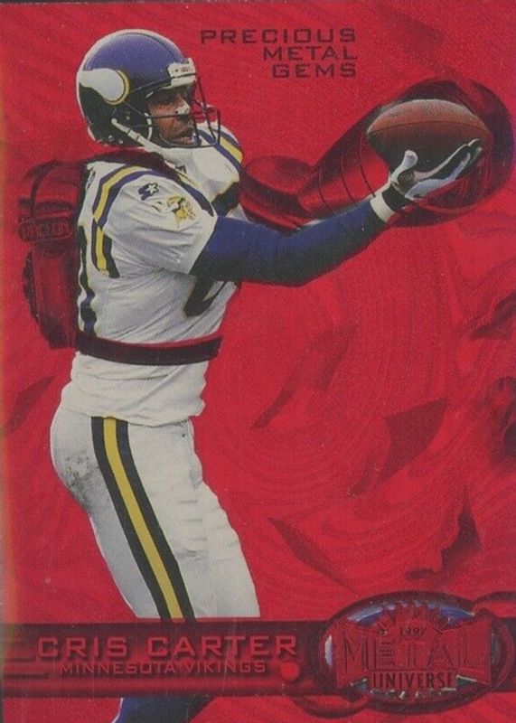 Cris Carter's Football cards are available in at least 130 sets. Cris Carter's biggest 7-day price movers are 1997 Metal Universe #143 Precious Metal Gems Red /135, 2025 Rookies & Stars #5 Touchdown Club - Purple /35, and 2025 Rookies & Stars #5 Touchdown Club - Gold /10.