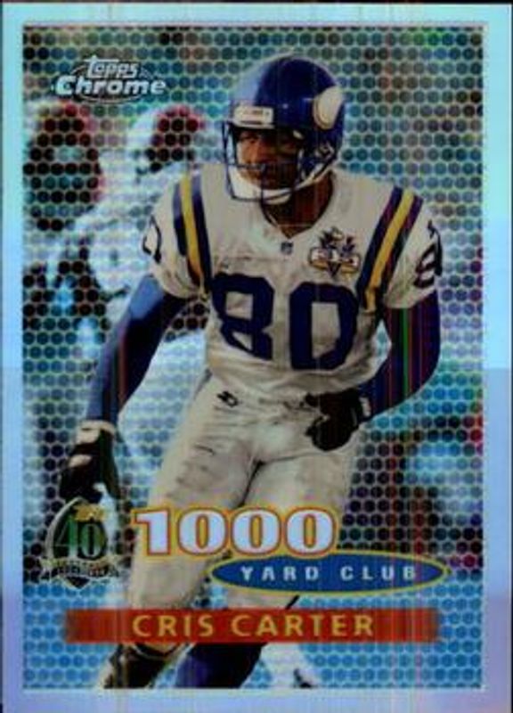 The Cris Carter 1996 Topps Chrome #94 Refractor card is 1 of 7 Cris Carter's card variations in the 1996 Topps Chrome set being tracked by Sports Card Investor, including #94 Base, #99 Base, #94 1,000 Yard Club - Refractor, #99 Refractor, and #8 40th Anniversary Retros.