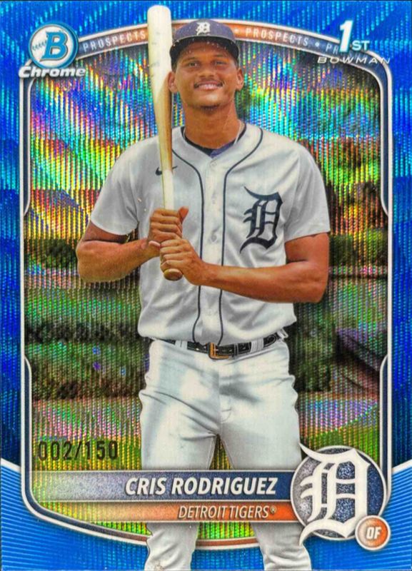 This card is 1 of 89 Cris Rodriguez's card variations in the 2025 Bowman Chrome set being tracked by Sports Card Investor, including International Refractor Variation, Prospect Auto (1st), Prospect Auto - Black & White Shimmer Refractor (1st), Prospects (1st), and Prospects - Mini-Diamond Refractor (1st).