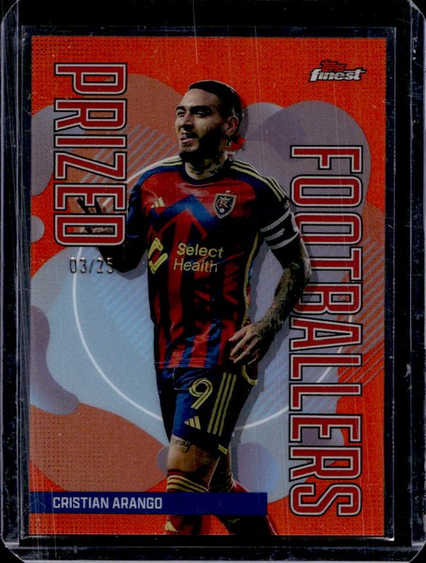 The Cristian Arango 2024 Topps Finest MLS #PF-13 Prized Footballers - Orange Refractor /25 card is 1 of 56 Cristian Arango's card variations in the 2024 Topps Finest MLS set being tracked by Sports Card Investor, including #1 Base, #101 Base, #201 Base, #201 Aqua Refractor, and #101 Aqua Refractor.