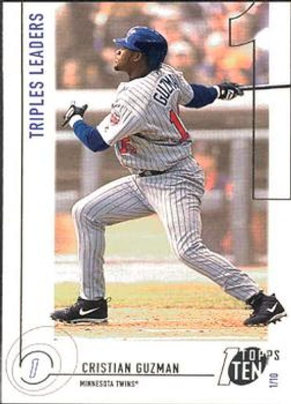 The Cristian Guzman 2002 Topps Ten #21 Base card is 1 of 4 Cristian Guzman's card variations in the 2002 Topps Ten set being tracked by Sports Card Investor, including Die-Cut, Autographs, and Relics.