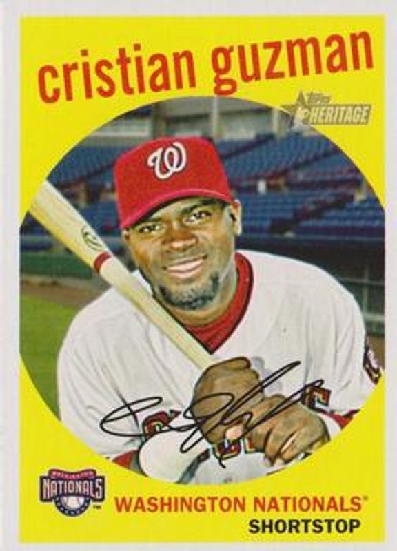The Cristian Guzman 2008 Topps Heritage #620 Base card is 1 of 4 Cristian Guzman's card variations in the 2008 Topps Heritage set being tracked by Sports Card Investor, including Chrome /1959, Chrome Refractor /559, and Chrome Refractor Black /59.