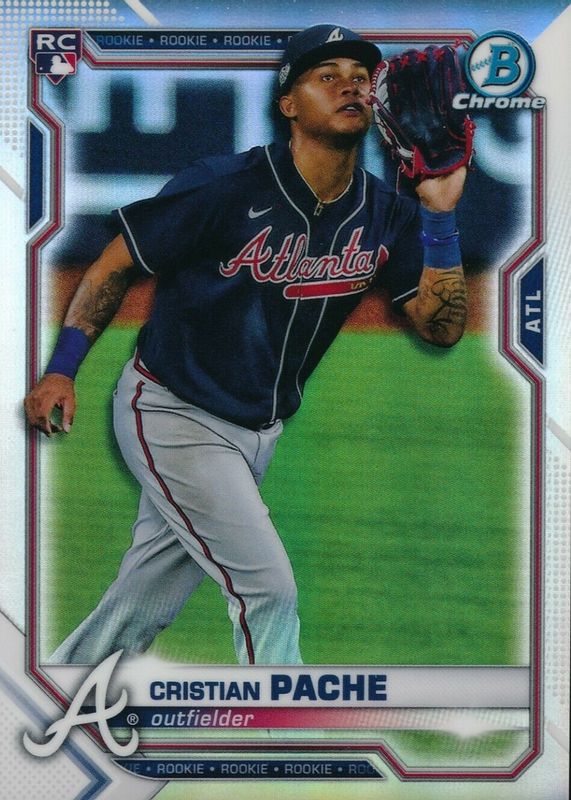 This card is 1 of 13 Cristian Pache's card variations in the 2021 Bowman Chrome set being tracked by Sports Card Investor, including Base, Refractor /499, Pink Refractor /299, Purple Refractor /250, and Fuchsia Refractor /199.