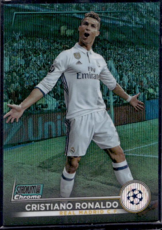 The Cristiano Ronaldo 2022 Topps Stadium Club Chrome UEFA Club Competitions #7 Aqua Wave Refractor /275 card is 1 of 50 Cristiano Ronaldo's card variations in the 2022 Topps Stadium Club Chrome UEFA Club Competitions set being tracked by Sports Card Investor, including Base, Blue Prism Refractor, Pink Red Electric Charge Refractor, Refractor, and Black & White Prism Refractor /350.