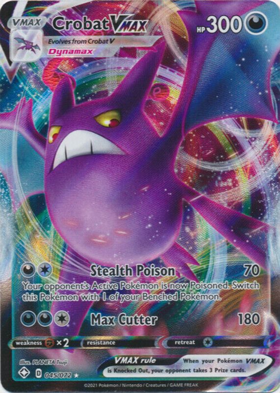 The Crobat VMAX 2021 Sword & Shield: Shining Fates #045/072 Holo card in Raw TCG (Near Mint) condition has moved down -$1.80 (-57.1%) in the last 30 days and was last sold for $1.35 .