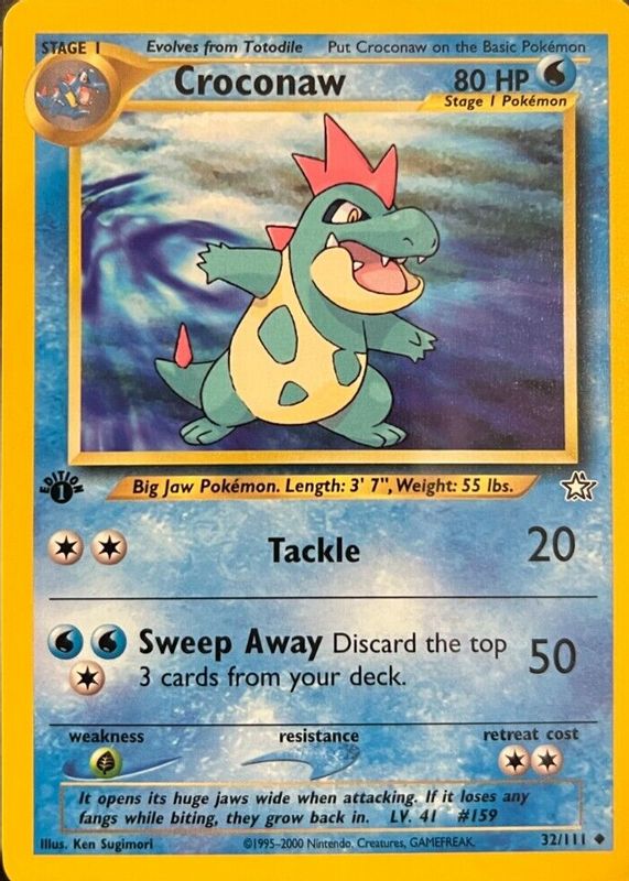 The Croconaw 2000 Neo Genesis #32/111 1st Edition card in Raw TCG (Near Mint) condition has moved up $0.88 (+9.8%) in the last 30 days and was last sold for $9.88 .