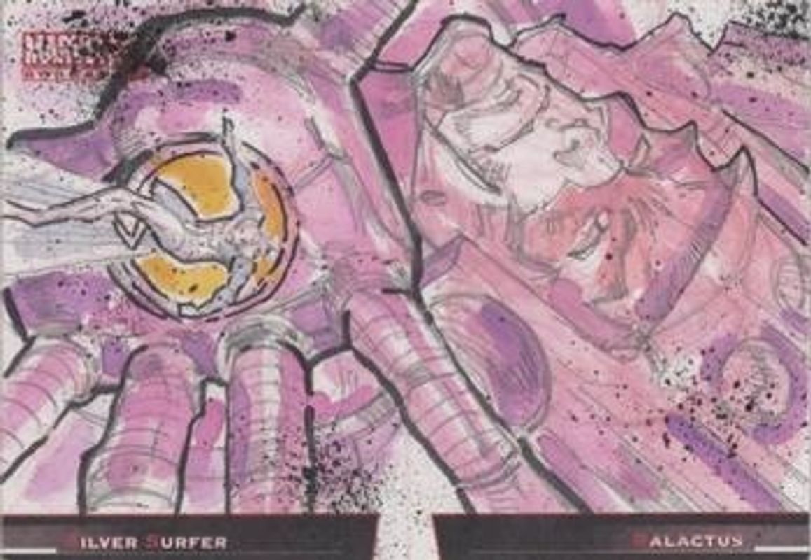 The Cruddie Torian 2021 Upper Deck Marvel Annual #BB1 Battle Booklet Sketch Cards Silver Surfer vs. Galactus card is 1 of 13 Cruddie Torian's card variations in the 2021 Upper Deck Marvel Annual set being tracked by Sports Card Investor, including Battle Booklet Sketch Cards Captain Marvel vs. Thor, Battle Booklet Sketch Cards Daredevil vs. Elektra, Battle Booklet Sketch Cards Hulk vs. Abomination, Battle Booklet Sketch Cards Ikaris vs. Thanos, and Battle Booklet Sketch Cards Luke Cage vs. Jessica Jones.