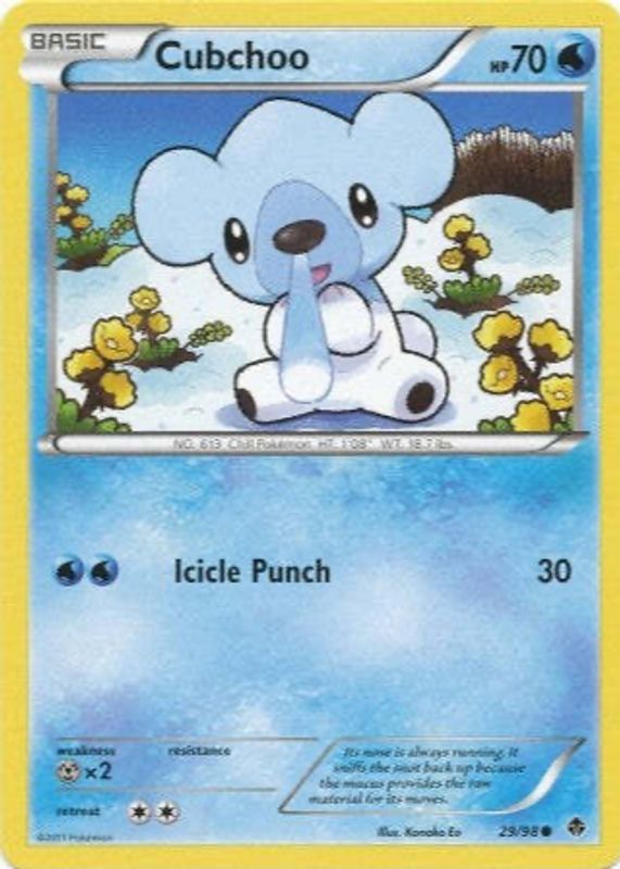 This card is 1 of 4 Cubchoo's card variations in the 2011 Black & White: Emerging Powers set being tracked by Sports Card Investor, including #28/98 Base, #28/98 Reverse Holo, and #29/98 Reverse Holo.