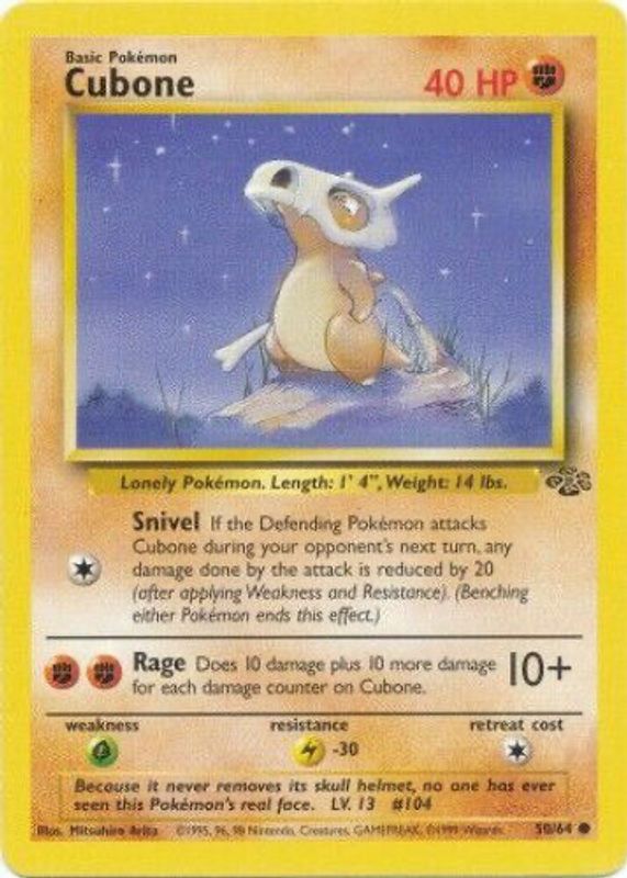 The Cubone 1999 Jungle #50/64 Unlimited card in Raw TCG (Near Mint) condition has moved up $0.40 (+20.1%) in the last 30 days and was last sold for $2.39 .