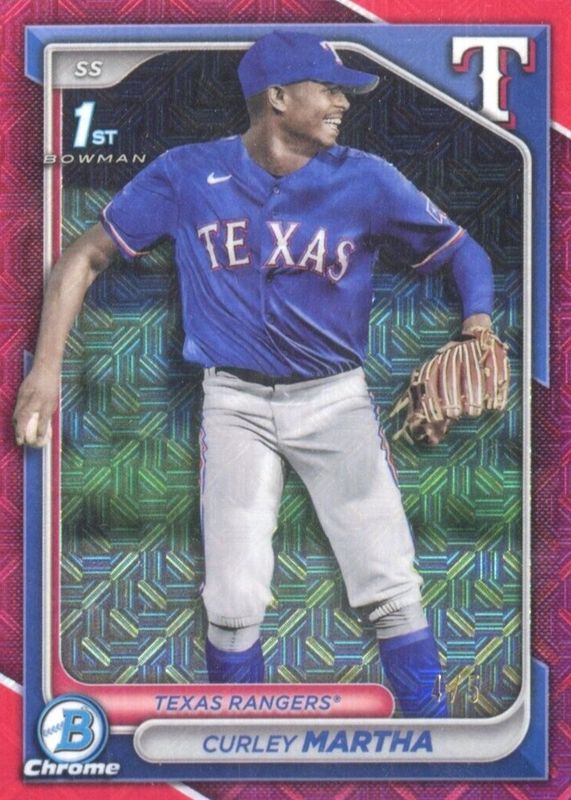 This card is 1 of 11 Curley Martha's card variations in the 2024 Bowman Chrome Mega Box set being tracked by Sports Card Investor, including Prospects (1st), Prospects - Aqua Mojo Refractor /299 (1st), Prospects - Purple Mojo Refractor /250 (1st), Prospects - Pink Mojo Refractor /199 (1st), and Prospects - Blue Mojo Refractor /150 (1st).