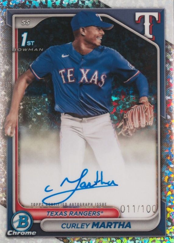 This card is 1 of 51 Curley Martha's card variations in the 2024 Bowman Chrome set being tracked by Sports Card Investor, including Prospects (1st), Prospects - Shimmer Refractor (1st), Prospects - Refractor /499 (1st), Prospects - Speckle Refractor /299 (1st), and Prospects - Purple Refractor /250 (1st).