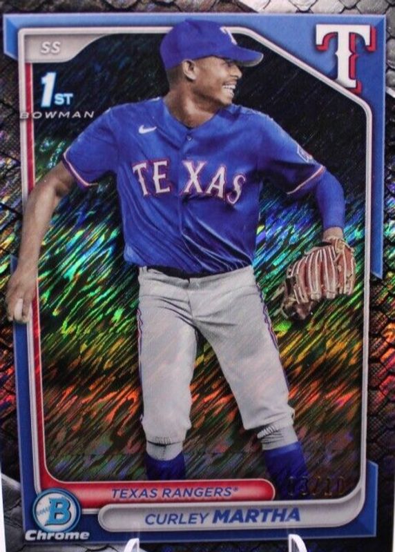 This card is 1 of 51 Curley Martha's card variations in the 2024 Bowman Chrome set being tracked by Sports Card Investor, including Prospects (1st), Prospects - Shimmer Refractor (1st), Prospects - Refractor /499 (1st), Prospects - Speckle Refractor /299 (1st), and Prospects - Purple Refractor /250 (1st).