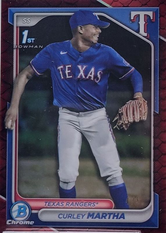 The Curley Martha 2024 Bowman Chrome #BCP-168 Prospects - Reptilian Red Refractor /5 (1st) card in Raw condition has not changed in price in the last 30 days and was last sold for $46.00 .