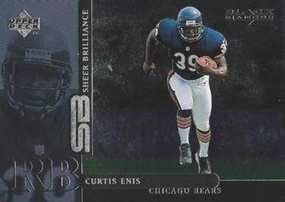 The Curtis Enis 1998 Upper Deck Black Diamond Rookie Edition #B24 Sheer Brilliance /1300 card is 1 of 9 Curtis Enis' card variations in the 1998 Upper Deck Black Diamond Rookie Edition set being tracked by Sports Card Investor, including Base, Double /2500, Triple /1000, Quadruple /100, and Jumbos.