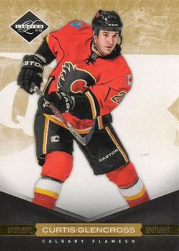 The Curtis Glencross 2011 Limited #173 Gold Spotlight /10 card is 1 of 8 Curtis Glencross' card variations in the 2011 Limited set being tracked by Sports Card Investor, including Base /299, Ruby Spotlight /49, Materials Prime /25, Monikers Gold /25, and Materials /10.