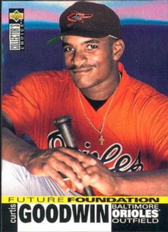 The Curtis Goodwin 1995 Upper Deck Collector's Choice #37 Base Rookie card is 1 of 3 Curtis Goodwin's card variations in the 1995 Upper Deck Collector's Choice set being tracked by Sports Card Investor, including Gold Signatures, and Silver Signatures.