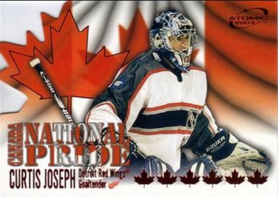 The Curtis Joseph 2002 Pacific Atomic #C5 National Pride card is 1 of 10 Curtis Joseph's card variations in the 2002 Pacific Atomic set being tracked by Sports Card Investor, including Base /1300, Hobby Parallel /775, Blue /175, Red /125, and Gold /99.