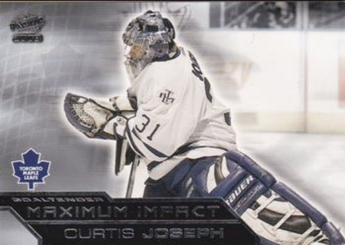 The Curtis Joseph 2002 Pacific #8 Maximum Impact card is 1 of 7 Curtis Joseph's card variations in the 2002 Pacific set being tracked by Sports Card Investor, including Base /999, Red, Blue /45, Nights SE /10, and The Big One Vancouver, Embossed /999.