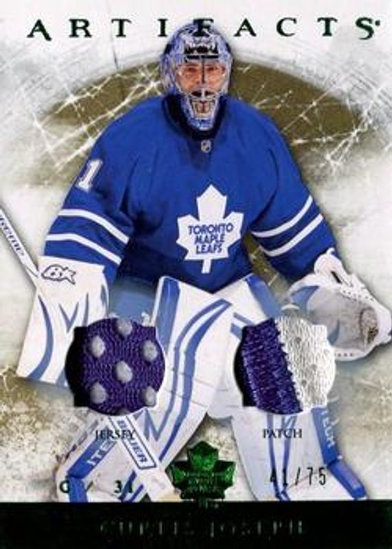The Curtis Joseph 2012 Upper Deck Artifacts #105 Jersey Patch - Emerald /75 card is 1 of 18 Curtis Joseph's card variations in the 2012 Upper Deck Artifacts set being tracked by Sports Card Investor, including Base /699, Emerald /99, Sapphire /85, Gold Spectrum /25, and Black /5.