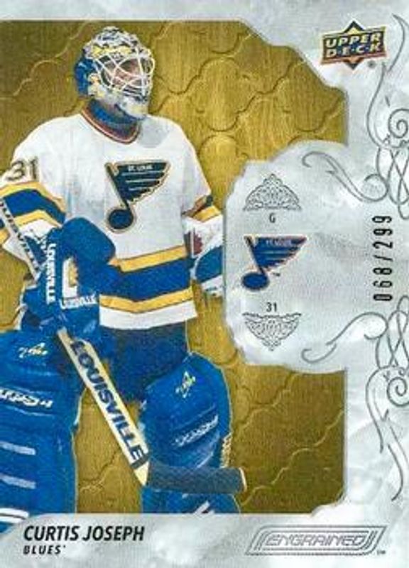 The Curtis Joseph 2019 Upper Deck Engrained #38 Base /299 card is 1 of 9 Curtis Joseph's card variations in the 2019 Upper Deck Engrained set being tracked by Sports Card Investor, including Ebony /49, Mahogany /10, Rosewood /1, Carved in Time, and Carved in Time Signatures.