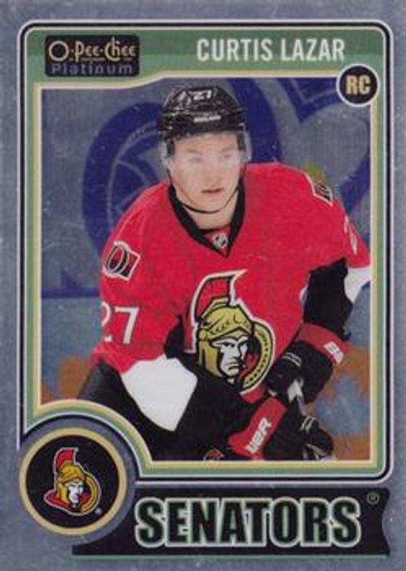 The Curtis Lazar 2014 O-Pee-Chee Platinum #186b Base Rookie card is 1 of 25 Curtis Lazar's card variations in the 2014 O-Pee-Chee Platinum set being tracked by Sports Card Investor, including Base, Platinum Traxx, Rainbow, White Ice /199, and Red Prism /135.