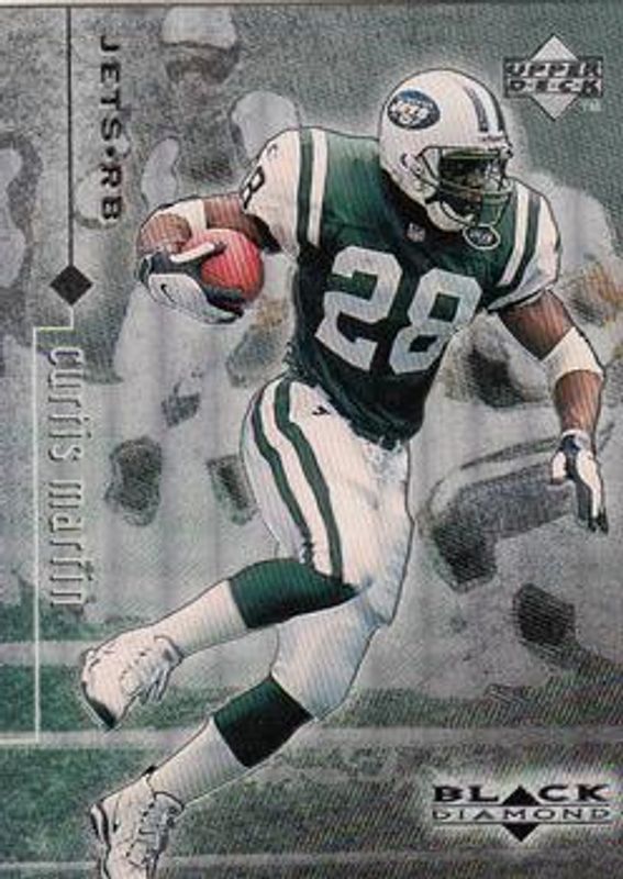 The Curtis Martin 1998 Upper Deck Black Diamond Rookie Edition #58 Base card is 1 of 8 Curtis Martin's card variations in the 1998 Upper Deck Black Diamond Rookie Edition set being tracked by Sports Card Investor, including Double /2500, Triple /1000, Quadruple /100, White Onyx /2250, and Sheer Brilliance /1300.