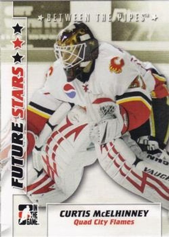 The Curtis McElhinney 2007 In The Game Between The Pipes #10 Base Rookie card is 1 of 9 Curtis McElhinney's card variations in the 2007 In The Game Between The Pipes set being tracked by Sports Card Investor, including Autographs, Emblems, Jerseys, Numbers, and Complete Logo AHL /1.