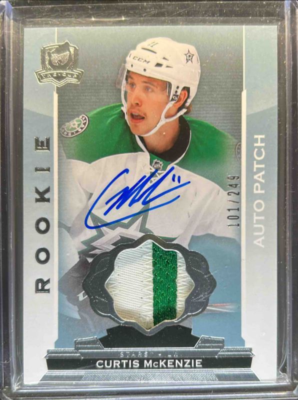 The Curtis McKenzie 2014 Upper Deck The Cup #103 Base /249 Rookie card is 1 of 40 Curtis McKenzie's card variations in the 2014 Upper Deck The Cup set being tracked by Sports Card Investor, including Gold Spectrum Autographs /25, Gold /10, Gold Foil /10, Red /3, and Black Foil /1.