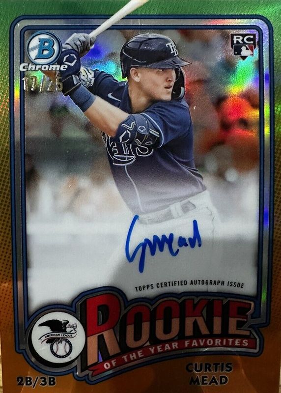 The Curtis Mead 2024 Bowman #ROY-CM Rookie of the Year Favorites Autographs - Orange Refractor /25 card in Raw condition has not changed in price in the last 30 days and was last sold for $21.50 .