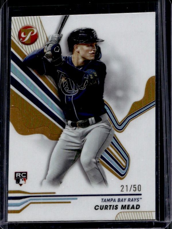 The Curtis Mead 2024 Topps Pristine #215 Gold Refractor /50 Rookie card is 1 of 35 Curtis Mead's card variations in the 2024 Topps Pristine set being tracked by Sports Card Investor, including Base, Pristine Refractor, Refractor, Green Refractor /150, and Pristine Purple Refractor /99.