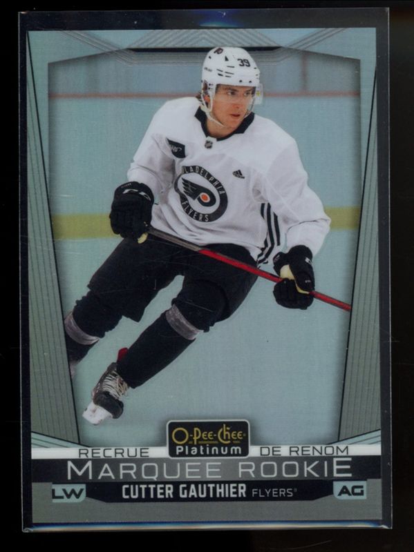 The Cutter Gauthier 2024 O-Pee-Chee #P-CG 2024-25 OPC Platinum Previews Rookie card is 1 of 39 Cutter Gauthier's card variations in the 2024 O-Pee-Chee set being tracked by Sports Card Investor, including Base, Blue Border, Red Border, Yellow Border, and Rainbow /350.