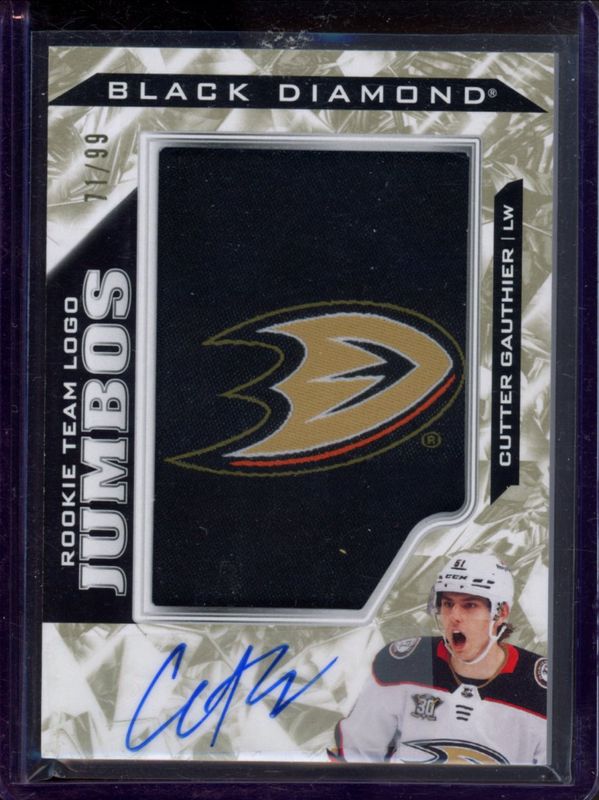 The Cutter Gauthier 2024 Upper Deck Black Diamond #RTL-CG Auto Rookie Team Logo Jumbos Patch Full Logo 1 /99 card is 1 of 68 Cutter Gauthier's card variations in the 2024 Upper Deck Black Diamond set being tracked by Sports Card Investor, including Base /349, Diamond Relic Rookies /99, Premium Relics /50, Autographs /49, and Diamond Relic Rookies Emerald /10.