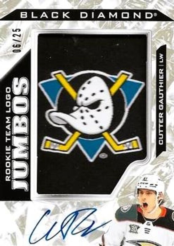 The Cutter Gauthier 2024 Upper Deck Black Diamond #RTL-CG Auto Rookie Team Logo Jumbos Patch Full Logo 3 /25 card is 1 of 68 Cutter Gauthier's card variations in the 2024 Upper Deck Black Diamond set being tracked by Sports Card Investor, including Base /349, Diamond Relic Rookies /99, Premium Relics /50, Autographs /49, and Diamond Relic Rookies Emerald /10.