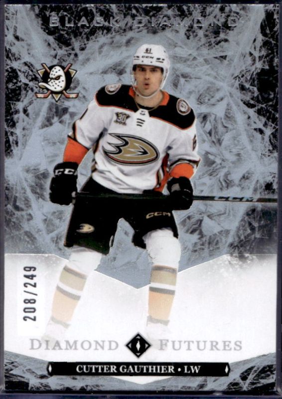 The Cutter Gauthier 2024 Upper Deck Black Diamond #BDF-CG Diamond Futures /249 Rookie card is 1 of 68 Cutter Gauthier's card variations in the 2024 Upper Deck Black Diamond set being tracked by Sports Card Investor, including Base /349, Diamond Relic Rookies /99, Premium Relics /50, Autographs /49, and Diamond Relic Rookies Emerald /10.