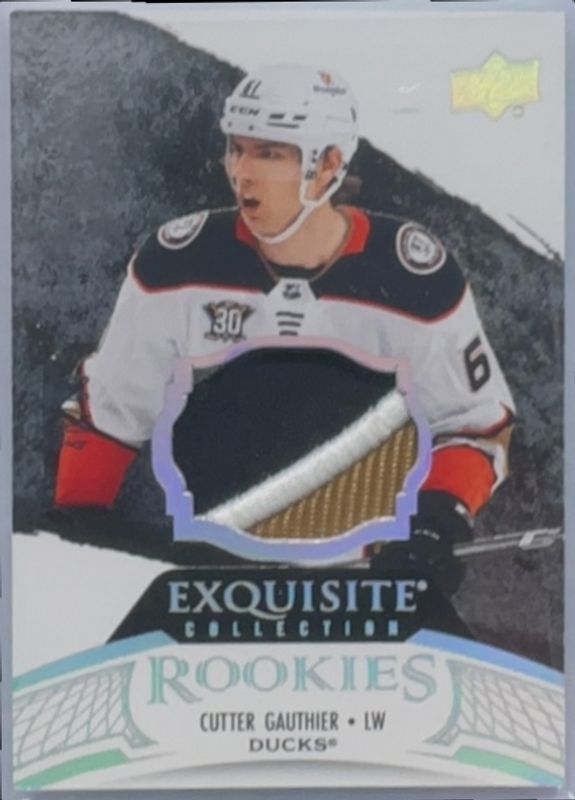 The Cutter Gauthier 2024 Upper Deck Black Diamond #RP-CG Exquisite Collection Rookie Patch /99 card is 1 of 68 Cutter Gauthier's card variations in the 2024 Upper Deck Black Diamond set being tracked by Sports Card Investor, including Base /349, Diamond Relic Rookies /99, Premium Relics /50, Autographs /49, and Diamond Relic Rookies Emerald /10.