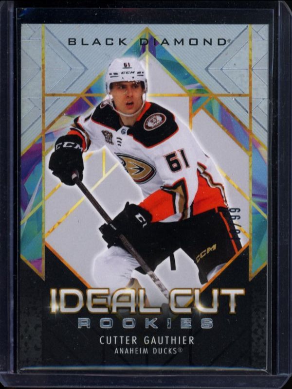 The Cutter Gauthier 2024 Upper Deck Black Diamond #ICR-CG Ideal Cut Rookies /99 card is 1 of 68 Cutter Gauthier's card variations in the 2024 Upper Deck Black Diamond set being tracked by Sports Card Investor, including Base /349, Diamond Relic Rookies /99, Premium Relics /50, Autographs /49, and Diamond Relic Rookies Emerald /10.