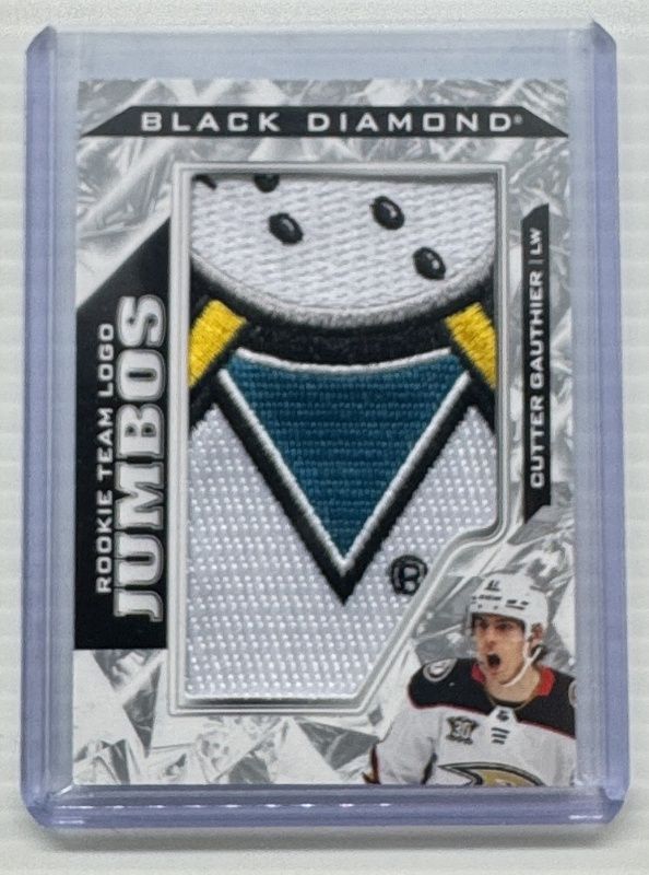 The Cutter Gauthier 2024 Upper Deck Black Diamond #RTL-CG Rookie Team Logo Jumbos Puzzle Patch card is 1 of 68 Cutter Gauthier's card variations in the 2024 Upper Deck Black Diamond set being tracked by Sports Card Investor, including Base /349, Diamond Relic Rookies /99, Premium Relics /50, Autographs /49, and Diamond Relic Rookies Emerald /10.