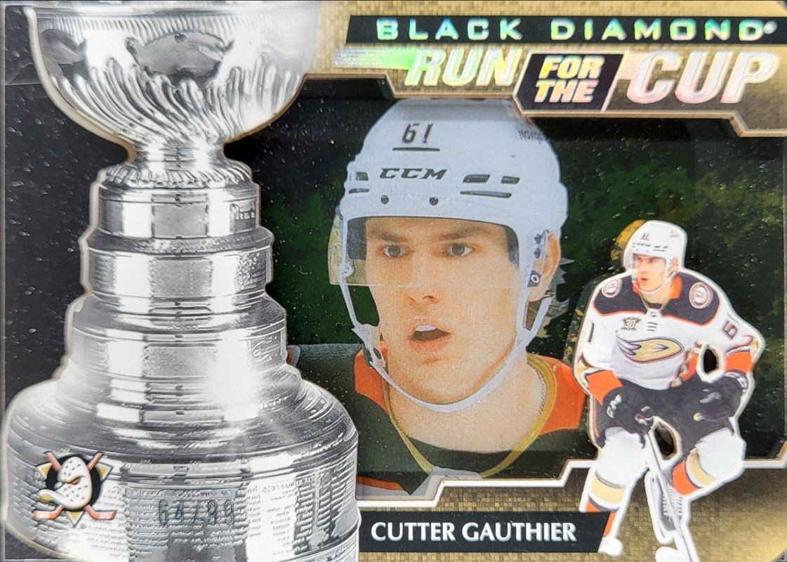 The Cutter Gauthier 2024 Upper Deck Black Diamond #RUN-CG Run for the Cup /99 Rookie card is 1 of 68 Cutter Gauthier's card variations in the 2024 Upper Deck Black Diamond set being tracked by Sports Card Investor, including Base /349, Diamond Relic Rookies /99, Premium Relics /50, Autographs /49, and Diamond Relic Rookies Emerald /10.
