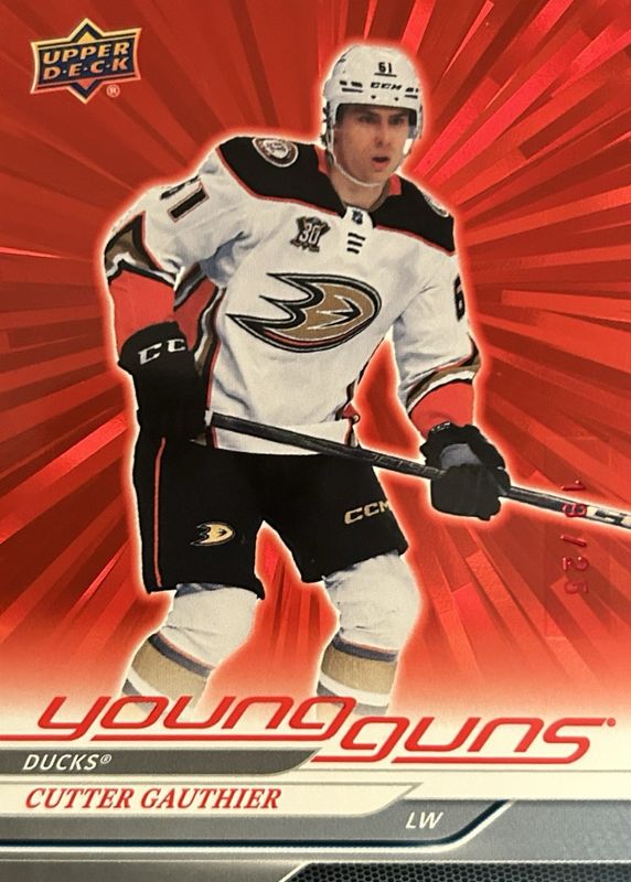 This card is 1 of 8 Cutter Gauthier's card variations in the 2024 Upper Deck set being tracked by Sports Card Investor, including Young Guns Base, Young Guns - Clear Cut, Young Guns - Outburst Silver, Young Guns - Deluxe /250, and Young Guns - UD Exclusives /100.