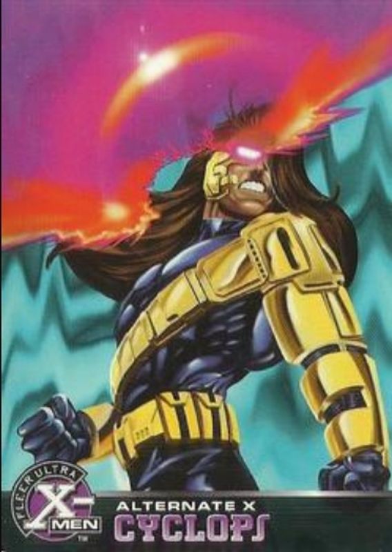 The Cyclops 1995 Fleer Ultra X-Men Chromium #8 Alternate X card is 1 of 7 Cyclops' card variations in the 1995 Fleer Ultra X-Men Chromium set being tracked by Sports Card Investor, including #92 Base, #5 Base, #92 Gold Signatures, #5 Gold Signatures, and Promos.