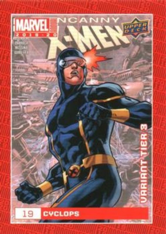 The Cyclops 2019 Upper Deck Marvel Annual #19 Variant Cover card is 1 of 9 Cyclops' card variations in the 2019 Upper Deck Marvel Annual set being tracked by Sports Card Investor, including Base, Fractal, Pack Wars, Hologram /20, and Printing Plate Cyan /1.