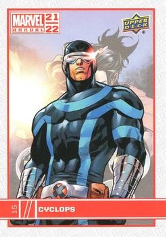 The Cyclops 2021 Upper Deck Marvel Annual #15 Base card is 1 of 16 Cyclops' card variations in the 2021 Upper Deck Marvel Annual set being tracked by Sports Card Investor, including Blue, Canvas Variant, Green, Magenta, and Red.