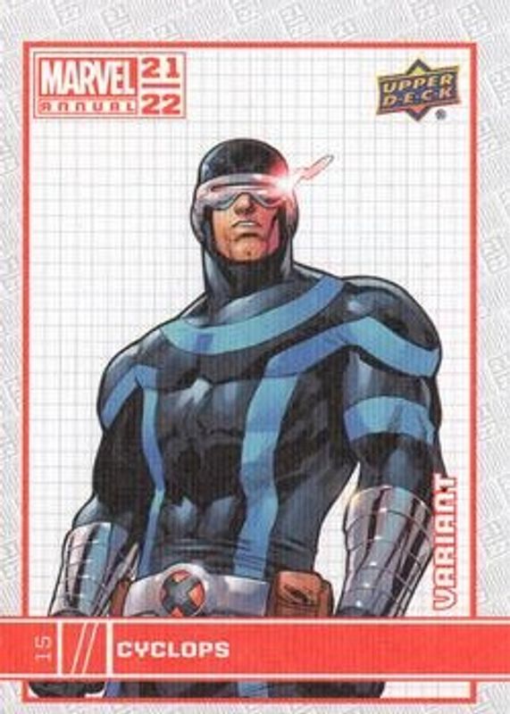 The Cyclops 2021 Upper Deck Marvel Annual #15 Canvas Variant card is 1 of 16 Cyclops' card variations in the 2021 Upper Deck Marvel Annual set being tracked by Sports Card Investor, including Base, Blue, Green, Magenta, and Red.