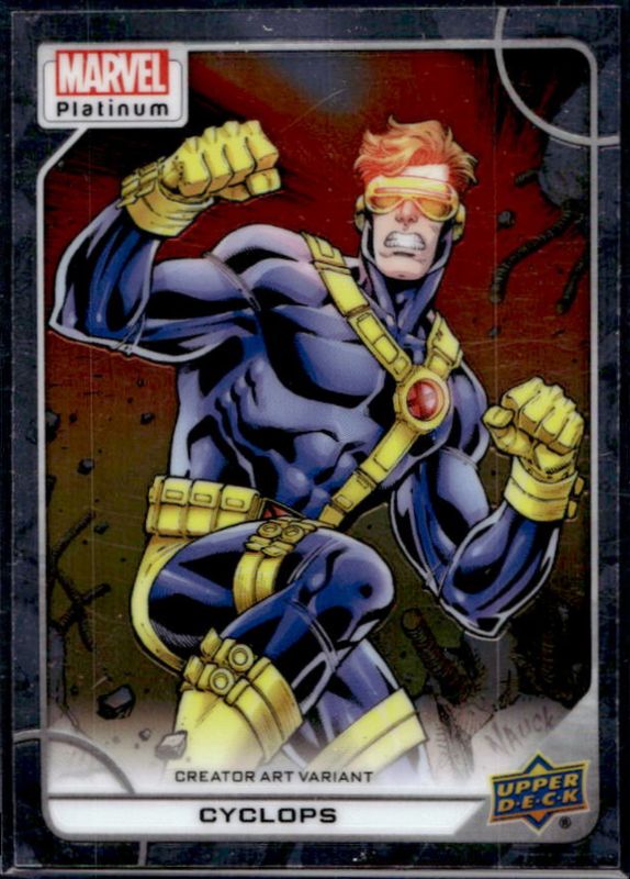 The Cyclops 2023 Upper Deck Marvel Platinum #60-V Creator Art Variant card is 1 of 57 Cyclops' card variations in the 2023 Upper Deck Marvel Platinum set being tracked by Sports Card Investor, including Base, Black Rainbow, Blue Rainbow, Blue Surge, and Purple Rainbow.