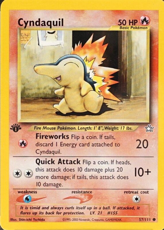 Cyndaquil's Pokemon cards are available in at least 19 sets. Cyndaquil's biggest 7-day price movers are 2007 Diamond & Pearl: Mysterious Treasures #079/123 Base, 2000 Neo Genesis #57/111 1st Edition, and 2000 Neo Genesis #56/111 1st Edition.